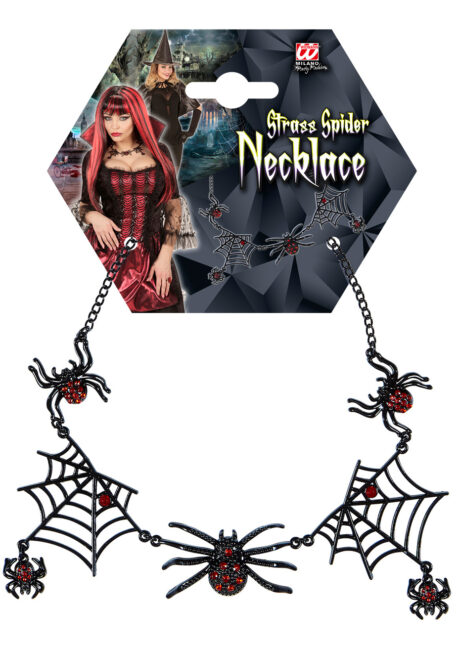 Collier en métal avec araignées, toiles d’araignées et strass rouges.