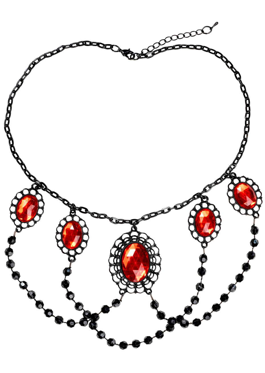 Ce collier gothique est un tour de cou noir et rouge, avec perles, chainette et pierres.