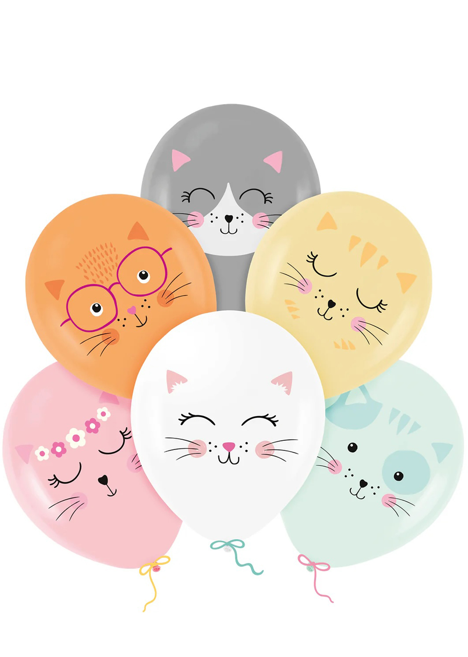 6 Ballons Imprimés Chats Multicolores, en Latex