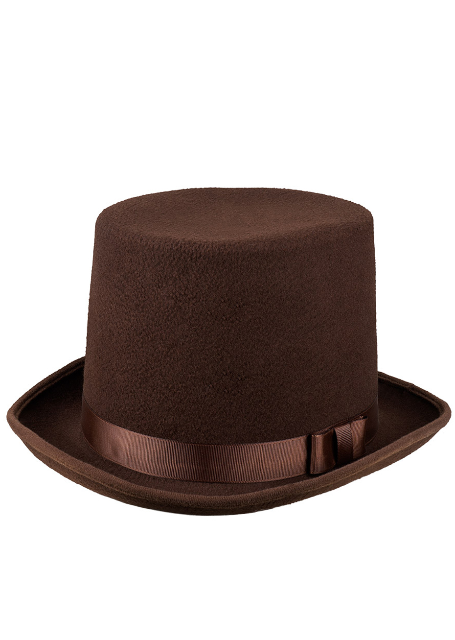 Très beau chapeau haut de forme marron, bordé d’un ruban satin à noeud plat.
