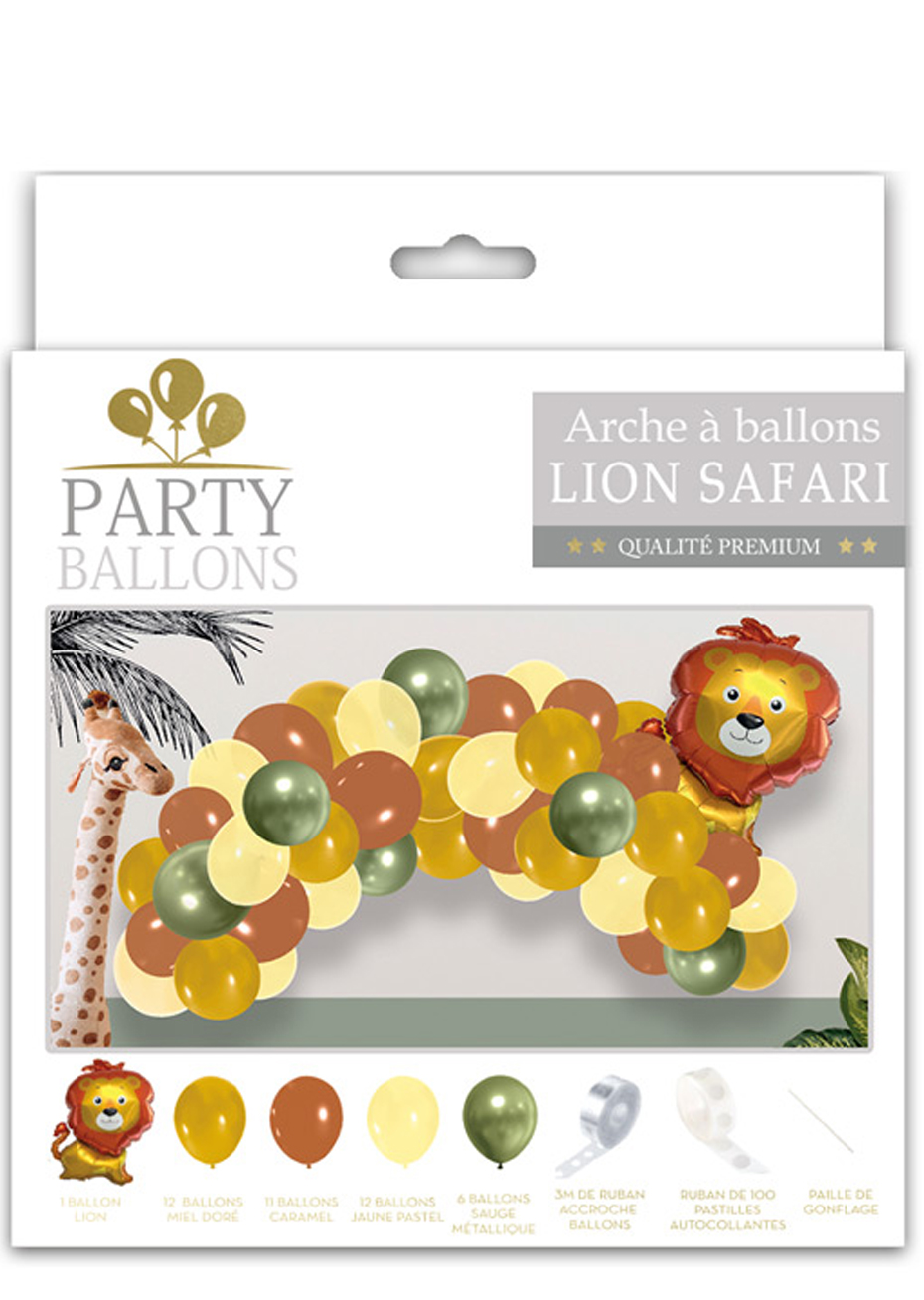 Ce kit complet permet la réalisation d’une arche souple de ballons et contient 41 ballons colorés dont 12 ballons miel doré, 11 ballons caramel, 12 ballons jaune pastel, 6 ballons sauge métallique ainsi qu’un ballon coloré en forme de Lion.