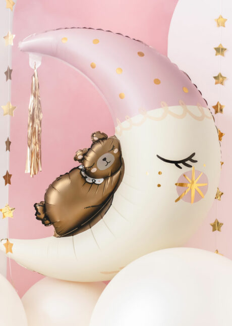 Ce ballon en forme de lune avec petit ours endormi sera parfait pour une baby shower, un anniversaire d’enfant, ou pour une décoration de chambre.