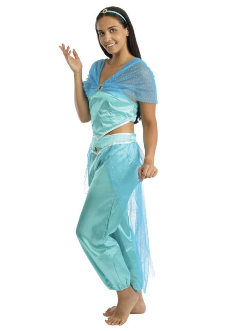 Le déguisement Jasmine danseuse orientale évoque la magie des contes de l’Orient. Il se compose d’un haut court, d’un pantalon fluide et d’un bandeau assorti. L’ensemble est léger, confortable et facile à porter. Idéal pour incarner une princesse orientale dans l’univers des 1001 Nuits.