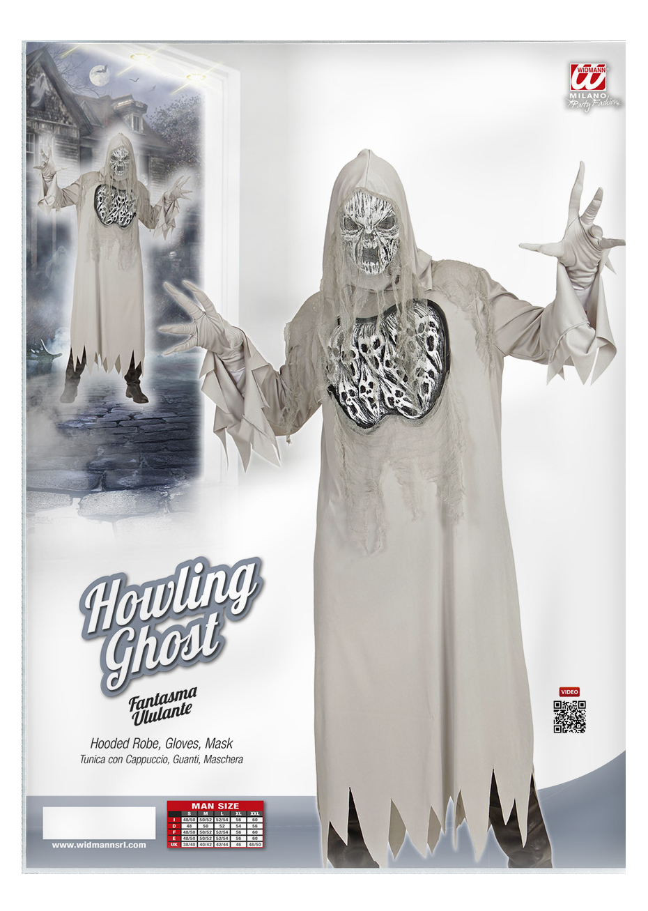 Faites frissonner votre entourage avec ce déguisement de fantôme hurlant, terrifiant et spectral. Il se compose d’une longue tunique grise à capuche, avec empiècement représentant plusieurs visages de spectres sur le torse. Les manches et le bas de la tunique sont découpés pour un effet effiloché. Le déguisement comprend également un masque effrayant et une paire de gants noirs assortis. Idéal Halloween.