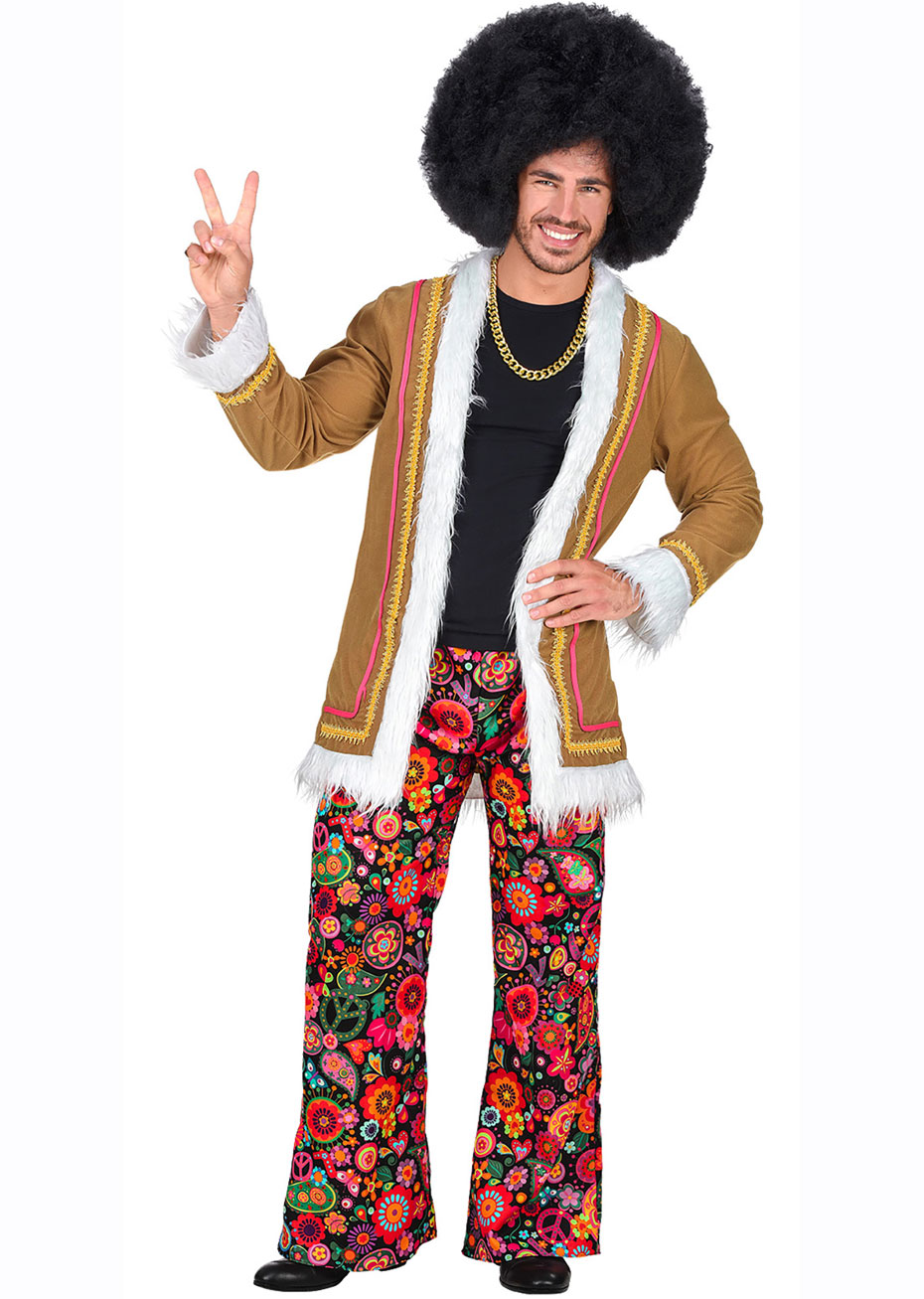 Replongez dans l’univers peace & love avec ce déguisement Hippie Woodstock. Il se compose d’une veste beige couleur daim avec bordures en fausse fourrure, et d’un pantalon coloré à fleurs. Un look bohème et rétro, parfait pour évoquer les années 60 et l’esprit Woodstock.