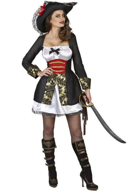 Ce déguisement de pirate pour femme combine style corsaire et détails baroques pour un effet chic et sexy. Il se compose d’une robe courte noire, blanche, rouge et dorée. La taille est cintrée pour souligner la silhouette, et la jupe bouffante apporte du volume. Les manches longues sont ornées de revers dorés à motifs baroques, assortis au jupon. Un chapeau complète la tenue. Parfait pour incarner une pirate élégante et audacieuse. Idéal soirées déguisées et évènements à thème.