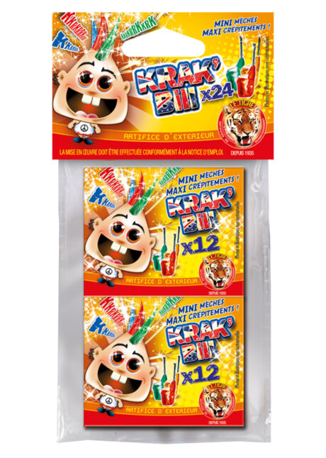 Les Krak Bill sont des petits artifices et pétards adaptés aux enfants à partir de 12 ans. Ce sachet contient 2 boîtes ludiques de 12 pièces. Les Krak Bill ont un effet crépitants puissants et intenses, pour le plus grand plaisir des apprentis artificiers. Pour une utilisation familiale.